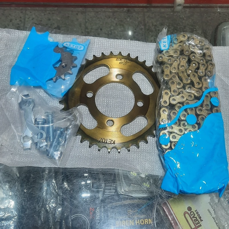 ست دنده زنجیر ویو شامل این قطعات دنده عقب فولادی و دنده جلو 14دانه زنجیر110دانه طلایی و ضخیم 4عددپیچ وخار دنده زنجیر عقب