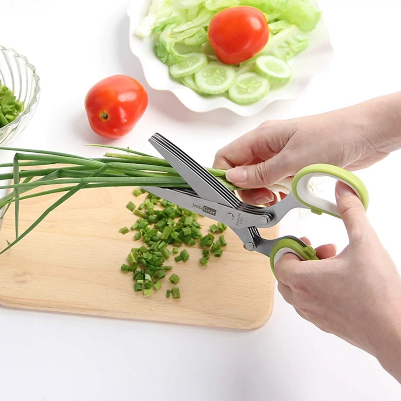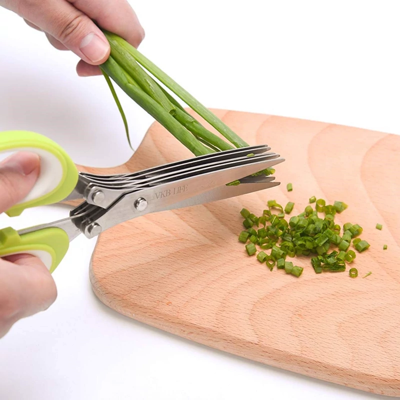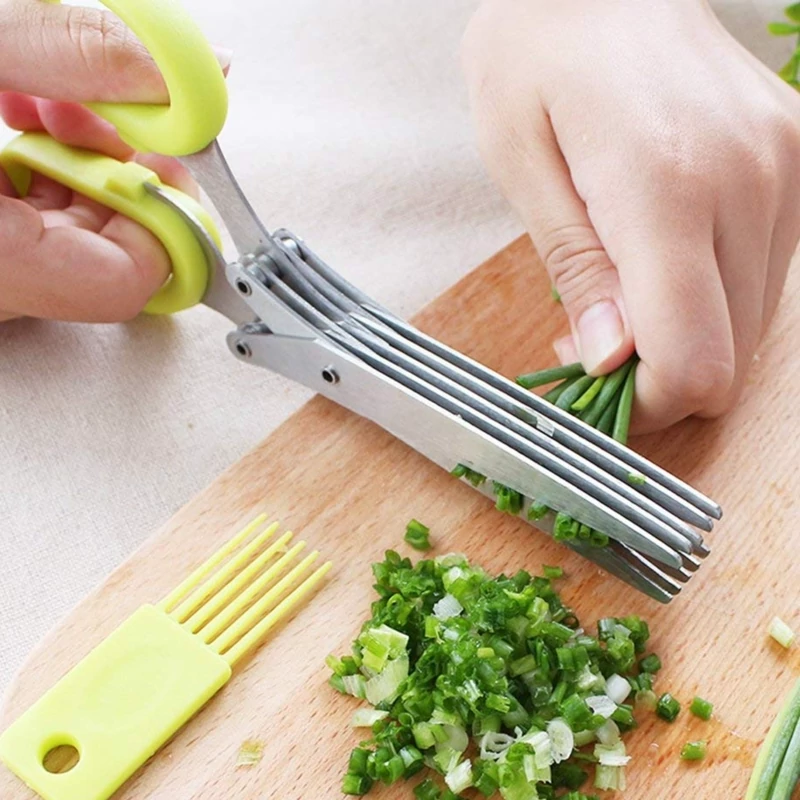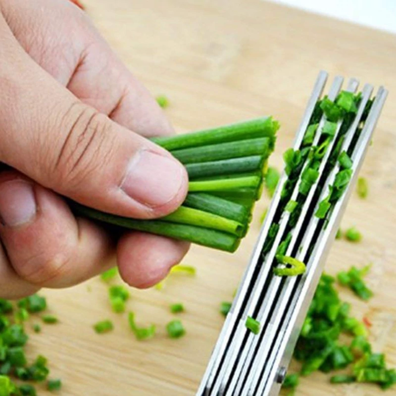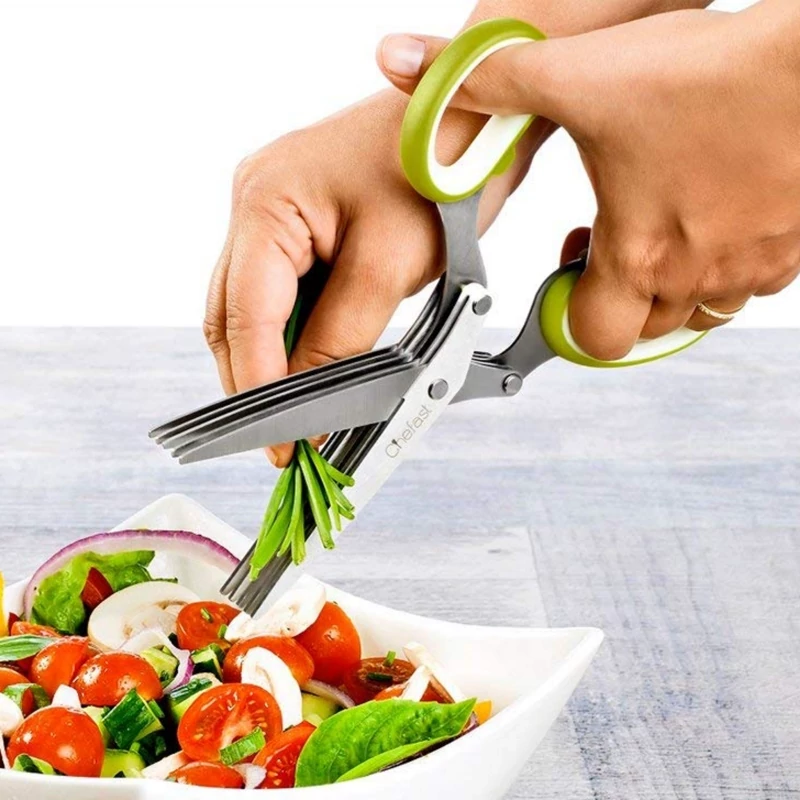 قیچی خردکن سبزیجات یک وسیله بسیار کارآمد برای خرد کردن سریع و آسان انواع سبزی ، کاغذ و . . . می باشد که با داشتن 10 لبه تیغه استیل بسیار تیز برش های یک اندازه و دقیق انجام می دهد. استفاده از این قیچی بسیار آسان و راحت است و دقیقاً شبیه به یک قیچی معمولی طراحی شده که تفاوت آن در تعداد تیغه ها می باشد و همزان 10 تیغه برای برش حرکت می کند. طراحی ارگونومیک و مدرن این قیچی امکان استفاده به صورت متوالی و در زمان طولانی را بدون خستگی برای شما فراهم می کند. از قیچی خرد کن علاوه بر سبزی می توانید در برش کاغذ و همچنین سفره آرایی یا میوه آرایی استفاده نمایید. جنس تیغه های این قیچی از استیل ضد زنگ می باشد و در برابر رطوبت یا مواد شوینده تغییر رنگ نخواهد داد.