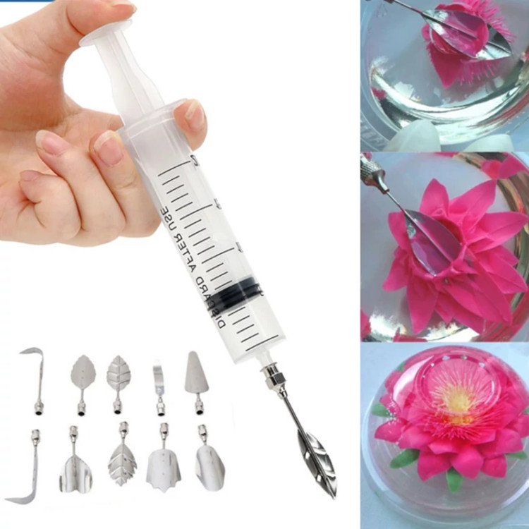 ست ابزار ژله تزریقی ، یک پکیج کامل و کارآمد برای طراحی ژله می باشد . این محصول شامل یک سرنگ تولید شده از جنس پلاستیک مرغوب و باکیفیت بوده که ظرفیتی معادل 20 میلی لیتر دارد به همراه 10 عددی سری با اشکال متنوع و زیبا تولید شده از جنس استیل است . کافیست محفظه سرنگ را از خامه و یا دیگر مواد مورد نظر خود پر کنید و سری انتخابی را روی خروجی سرنگ قرار داده و کمی به سمت داخل فشار دهید ، بدین ترتیب ابزار به صورت کامل آماده خواهد بود ، حالا می توانید به هنرنمایی خود بر روی ژله بپردازید . با این روش علاوه بر ایجاد یک طراحی متفاوت بر روی ژله می توانید ژله سه بعدی نیز درست کنید به گونه ای که بر روی میز سرو غذا شاهد یک تابلوی زنده باشید . وقت تغییر است ، تفاوتی ندارد داخل آشپزخانه منزل باشید یا هتل و رستوران ، کافیست بخواهید .