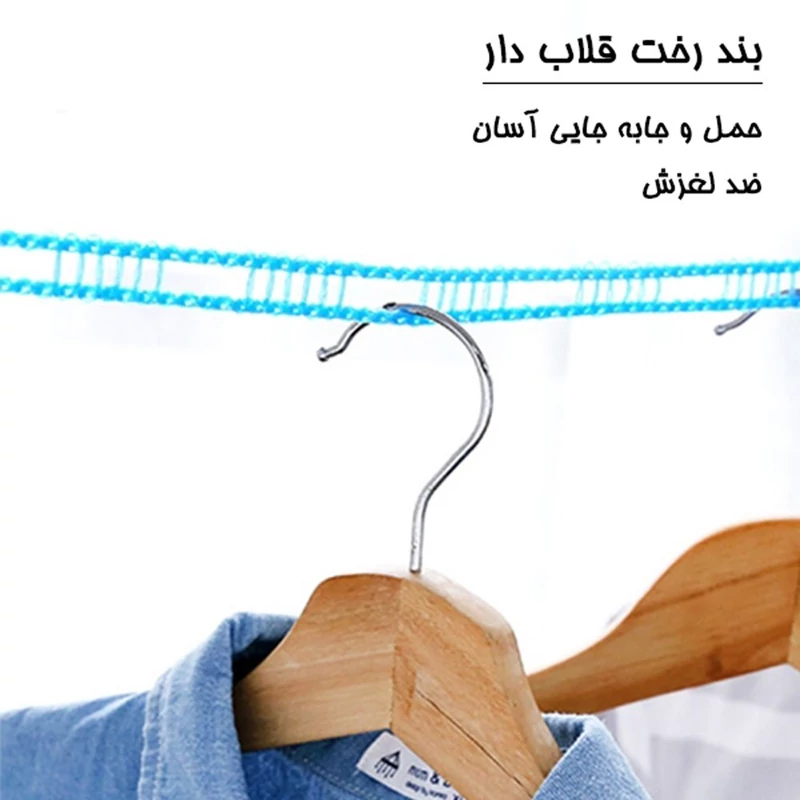 بند رخت قلاب دار ، نمونه ای جدید از طناب هایی است که برای آویزان کردن لباس طراحی و ارائه شده . دو بند که به صورت موازی یکدیگر قرار دارند و با استفاده از رشته هایی در فواصل معین به هم متصل شده اند ، خصوصیتی که مقومت کالا را بالا برده و برخلاف نمونه های کاملاً گرد مانع از افتادن و سر خوردن آسان لباس از روی بند می شود . ویژگی دیگر بند رخت را می توان دو قلاب تعبیه شده در دو طرف کالا عنوان کرد که امکان نصب و جداسازی سریع و آسان طناب رخت متناسب با ابعاد مورد نیاز را فراهم آورده بدین ترتیب نیازی به ماندن مداوم بند در یک محیط نیست و به راحتی پس از استفاده قابل جمع شدن و یا در زمان نیاز نصب آسان و سریع است . قلاب ها را می توانید از طناب جدا کرده و در فاصله مورد نظر خود روی بند قرار دهید ، بنابراین محدودیتی در استفاده از آن برای فضاهای کوچکتر نیز وجود ندارد . حیاط ، تراس ، پشت بام ، داخل آپارتمان و یا هر جای دیگری که نیاز داشته باشید در اختیار شما خواهد بود .