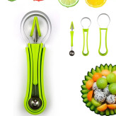 ابزار میوه آرایی ، یک ست ابزار کوچک و بسیار کاربردی جهت استفاده در آشپزخانه است . این محصول شامل چهار ابزار با عنوان قالب زن توپی ، پوست کن ، خالی کننده تخم و برش زن مثلثی می باشد که از ترکیب پلاستیک مقاوم و استیل با کیفیت تولید گردیده . قالب زن توپی مناسب برای جداسازی میوه ها نظیر هندوانه به شکل قطعات کروی شکل کوچک می باشد که علاوه بر زیبایی ظاهری ، سرو و میل کردن آسان تری را به همراه خواهد داشت . پوست کن ، امکان استفاده برای جداسازی پوست میوه هایی نظیر هندوانه ، خربزه و گرمک از میوه اصلی را به شکل ساده و یک دست را محیا می کند ، البته می توانید با جدا کننده تخم نیز ، تخم این قبیل میوه ها که بر روی سطح آنها است را به آسانی جداسازی نمود. اما رکن اصلی و اساسی یک ست میوه آرایی ، چاقوی برش آن است که در این محصول نیز به شکل مثلثی برای برش خاص وجود دارد . قسمت سری چاقوی میوه آرایی به دلیل تیز و باریک تر بودن ، قابل بهره برداری برای حکاکی روی پوست میوه نیز می باشد . بنابراین به سادگی می توانید بر روی پوست میوه اشکال دلخواه خود را طراحی و برش بزنید تا بر زیبایی آن بیافزایید . از ست چهارتایی ابزار میوه آرایی می توانید برای تزیین میوه بدون نیاز به مهارت قبلی در منزل و تنها با استفاده از خلاقیت خود استفاده نمایید .