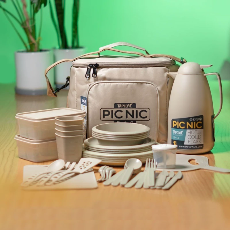 پک مسافرتی چهار نفره پیک نیک ، برند تاپکو ، محصولی جدید و در عین حال بسیار کارآمد برای اهل گردش و طبیعت گردی . این کالا بر خلاف نمونه های معمول که تابه حال دیده اید ، به جای باکس دارای یک ساک برزنتی بسیار باکیفیت و در عین حال مقاوم می باشد ، بنابراین دیگر نگران شکستن و یا آسیب دیدن ان در اثر اتفاقات مختلف از جمله بر خورد با سطوح نباید بود . ساک پیک نیک قابلیت حمل به صورت دستی و همچنین آویز روی دوش را دارد تا کاربر امکان حمل و جابه جایی آسان در شرایط گوناگون را داشته باشد . محتویات درون کیف پیک نیک مناسب برای 4 نفر طراحی شده که شامل یک عدد فلاسک 1 لیتری ، قاشق ، چنگال و کفگیر آشپزی ، دو عدد باکس که هر کدام درون خود ظروف کوچکتری برای استفاده مجزا و یا تقسیم فضای داخلی ظرف را دارند ، 4 عدد بشقاب ، 4 عدد کاسه ، 4 عدد پیش دستی ، 4 عدد قاشق غذاخوری ، 4 عدد چنگال ، 4 عدد کارد میوه خوری ، 4 عدد قاشق چای خوری ، 4 عدد لیوان به همراه نمکدان دوقلو ، بادبزن و تخته گوشت می باشد ، کالاهایی که از جنس پلاستیک فشرده مقاوم و باکیفیت تولید شده اند و استحکام لازم برای استفاده هار مکرر را دارند ، از سویی دیگر به سادگی قابل شستشو هستند بنابراین همه چیز برای ساده تر شدن یک گردش روزانه برای شما فراهم خواهد بود .