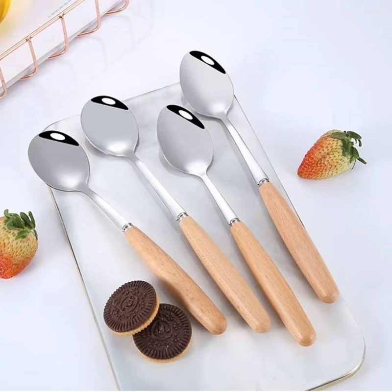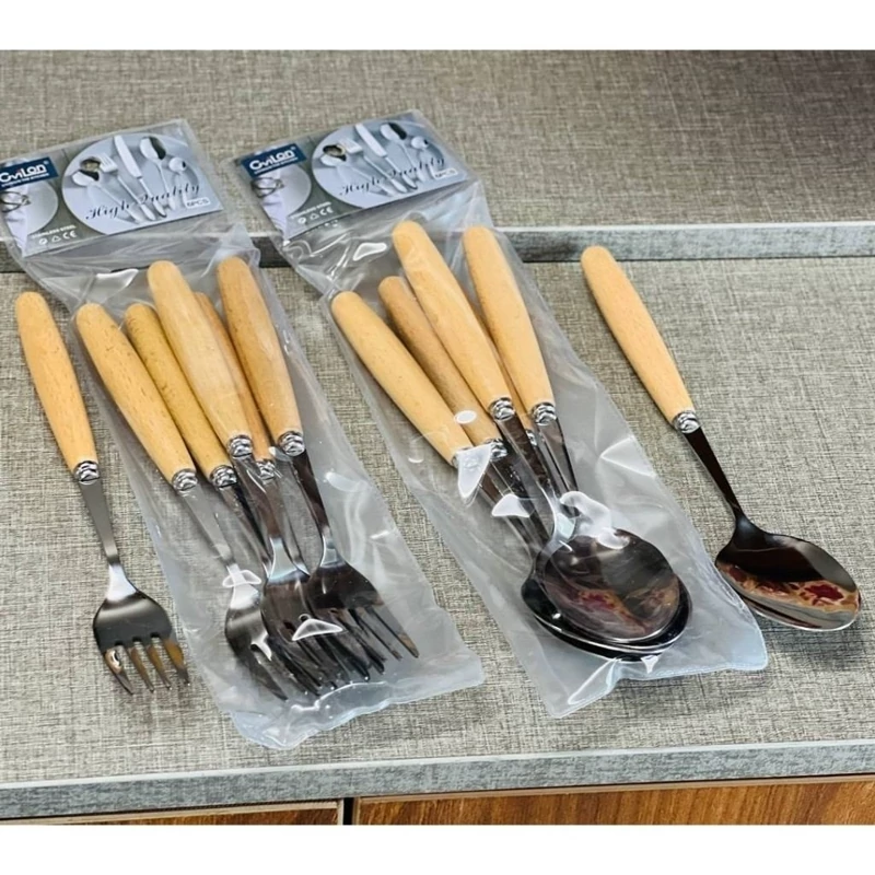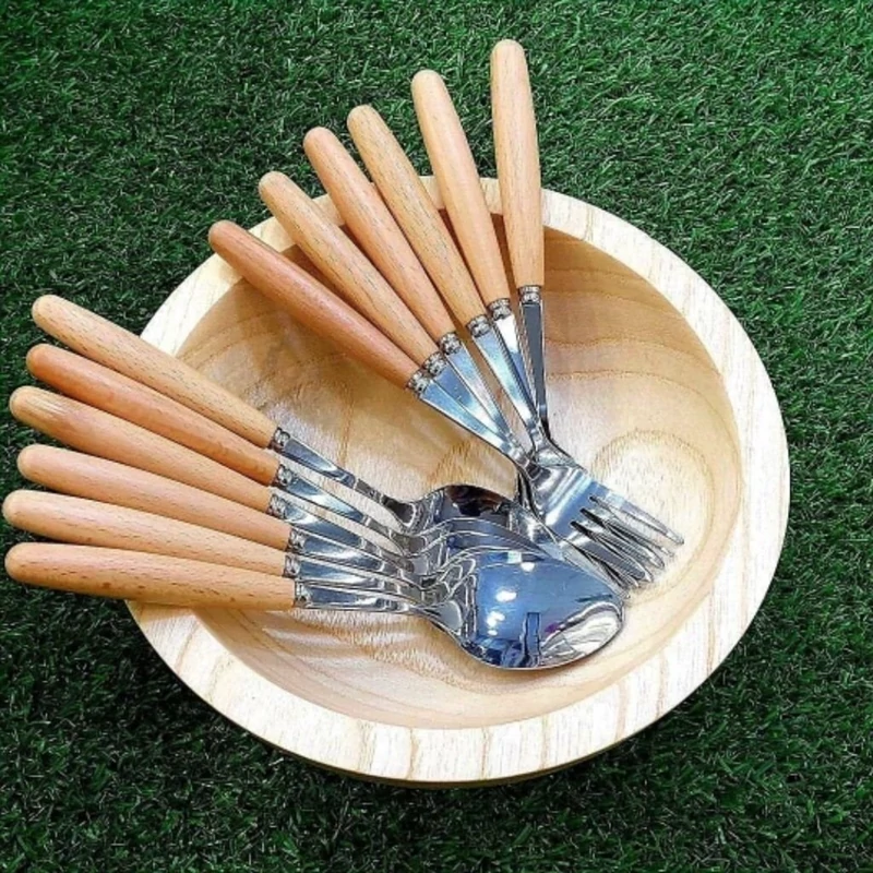 📌قاشق چنگال دسته چوبی 📏6 قاشق 6 چنگال 🌈تک رنگ 🔸️ساخت 🇨🇳 ❇️جنس بامبو استیل