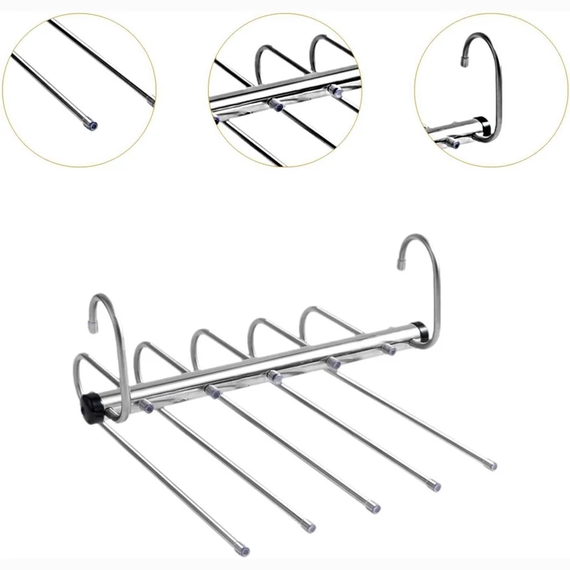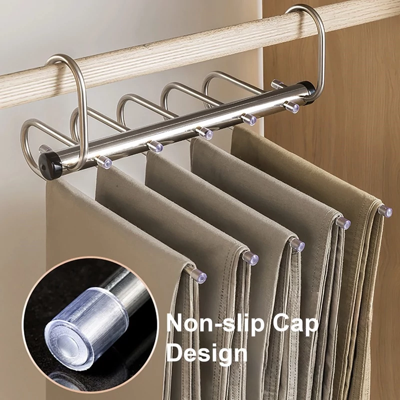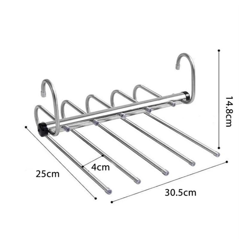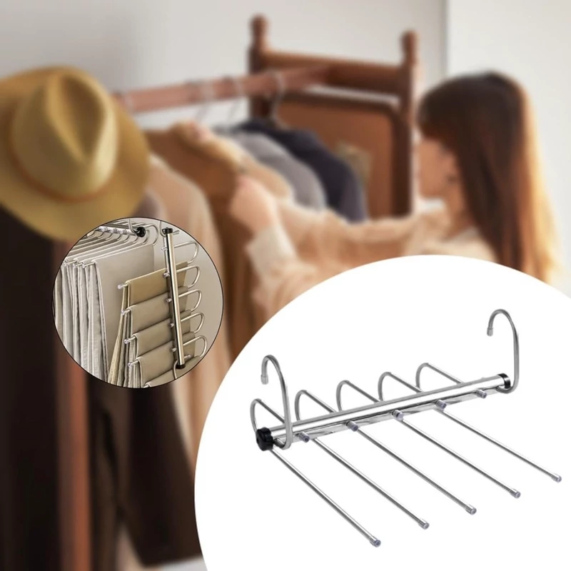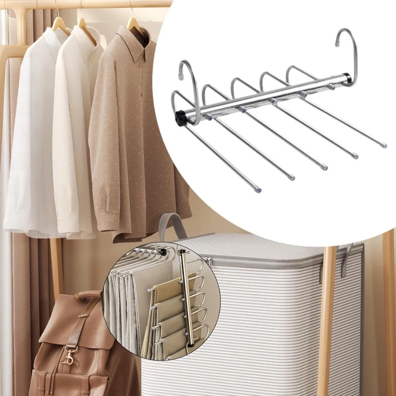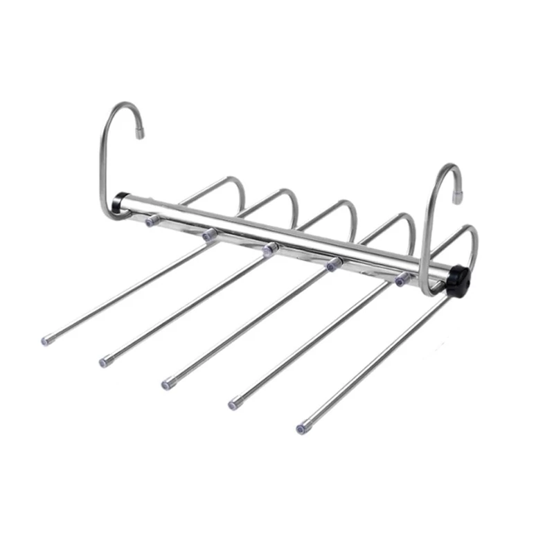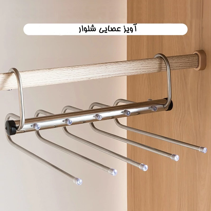 آویز عصایی شلوار ، نمونه ای جدید از چوب لباسی های داخل کمد می باشد که بیشتر مناسب برای آویزان کردن شلوار طراحی شده ، اما قابلیت بهره گیری برای برخی از لباس های دیگر نظیر شال را نیز دارد . کالا دارای یک بازوی اصلی است که در دو طرف خود دو قلاب برای آویزان کردن داخل کمد دارد ، قلاب هایی که در صورت نیاز می توانید با آویزان کردن هر دوی آنها چوب لباسی را به صورت افقی و یا تنها بر روی یک آویز به صورت عمودی داخل کمد قرار دهید ، بدین ترتیب امکان استفاده حداکثری از فضای موجود را خواهید داشت . در میانه بازوی اصلی پنج آویز به شکل عصا قرار گرفته که از یک طرف باز می باشند ، این طراحی مناسب برای آویزان کردن شلوار به صورت تاشده می باشد با امکان دسترسی سریع و آسان بدون نیاز به تغییر حالت آویز لباس تاشو . لبه های نگهدارنده لباس با استفاده از پوشش های پلاستیکی محافظت می شوند تا در تماس با لباس ها آسیبی به آنها وارد نکنند . از این محصول می توانید برای نگهداری شلوار ، شال ، روسری و لباس هایی از این قبیل داخل کمد استفاده کنید.