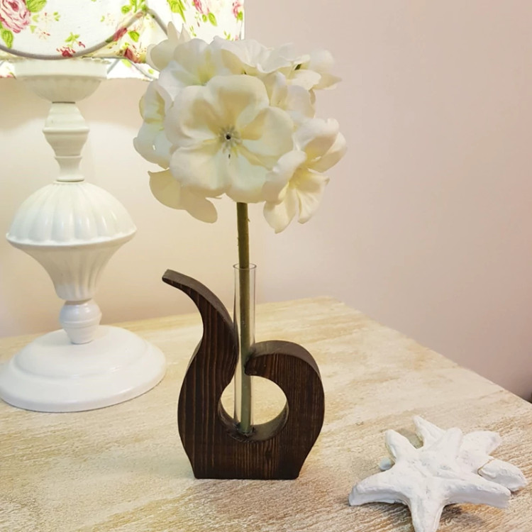 گلدان چوبی مدل لاله ، یک گلدان زیبا با طراحی نوین می باشد که از جنس چوب مرغوب و با کیفیت تولید شده است . شکل ظاهری گلدان همانند لاله ای است که یکی از گلبرگ های آن به سمت داخل برگشته و گلبرگ دیگر همانند حالت معمول باز می باشد ، اما زیبایی این گلدان فانتزی را می توان محفظه لوله ای شکل شفافی دانست که در میان دو گلبرگ جای داده شده . این محفظه دارای دهانه ای کوچک به قطر 1 سانتی متر می باشد که محل قرارگیری یک یا حداکثر دو شاخه گل متناسب با ابعاد محفظه است . در میان لاله چوبی شاخه گلی زیبا قرار می گیرد که می تواند زیبایی و جلوه ای متفاوت را برای تزئین روی میز شما به ارمغال بیاورد .