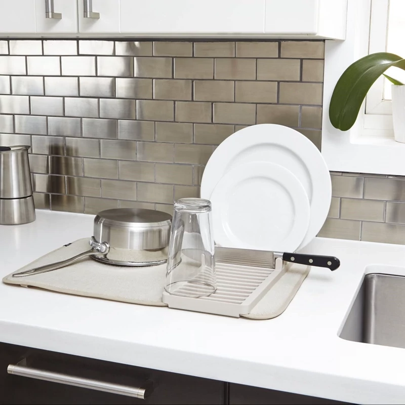 نمگیر استند دار ، محصولی با طراحی زیبا ، مدرن و کاربردی جهت استفاده در کنار انواع سینک ظرفشویی می باشد . این محصول متشکل از یک پد نمگیر با ضخامت مناسب برای آبگیری ظروف شسته شده و یک استند برای قرار دادن ظروف مختلف با ابعاد کوچک نظیر بشقاب ، چاقو ، کفگیر و ... است . استند ظروف از جنس پلاستیک مقاوم و با کیفیت تولید شده که قابلیت جداسازی و همچنین اتصال آسان به پد در صورت نیاز را دارد ، بنابراین می توانید جهت شست و شوی نمگیر ، آن را از استند جدا نمایید . بارزترین ویژگی آبگیر ظروف کنار سینک را می توان قابلیت تاشدن پد بر روی استند و همچنین جابه جایی آن عنوان نمود ، بدین ترتیب که در صورت عدم نیاز به پد می توانید به سادگی آن را بر روی استند تا کنید تا فضای بسیار کمتری را داخل کابینت ، کشو و ... برای نگهداری اشغال نماید ، از سوی دیگر امکان جابه جایی آسان آن را داشته باشید . از این محصول علاوه بر کنار سینک ، بر روی کابینت ، هنگام سفر و کمپینگ نیز می توان بهره برد .