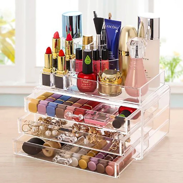 جا لوازم آرایشی رومیزی ، محصولی با طراحی نوین و بسیار جادار است . باکس لوازم آرایشی به شما این امکان را می دهد تا بسیاری از وسایل و لوازم آرایشی ، زیورآلات و ... را به راحتی در یک جا جمع کنید و نظم بدهید تا در صورت نیاز به سادگی در دسترس باشند . این محصول دارای دو قسمت شامل کشوها و استند لوازم است که بر روی هم قرار می گیرند و مجموعاً دارای 16 محفظه و 3 کشو می شوند . نگهدانده لوازم آرایشی از جنس اکریلیک تولید شده که در عین شفافیت ، مقاوم نیز می باشد .