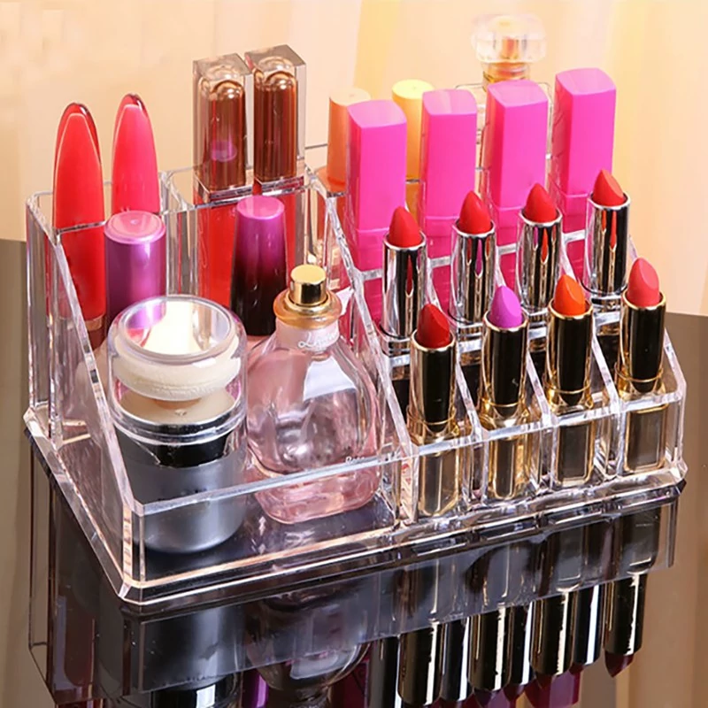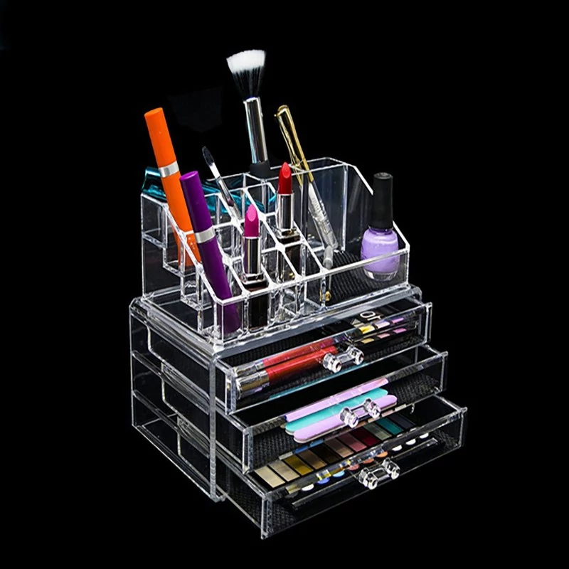 جا لوازم آرایشی رومیزی ، محصولی با طراحی نوین و بسیار جادار است . باکس لوازم آرایشی به شما این امکان را می دهد تا بسیاری از وسایل و لوازم آرایشی ، زیورآلات و ... را به راحتی در یک جا جمع کنید و نظم بدهید تا در صورت نیاز به سادگی در دسترس باشند . این محصول دارای دو قسمت شامل کشوها و استند لوازم است که بر روی هم قرار می گیرند و مجموعاً دارای 16 محفظه و 3 کشو می شوند . نگهدانده لوازم آرایشی از جنس اکریلیک تولید شده که در عین شفافیت ، مقاوم نیز می باشد .