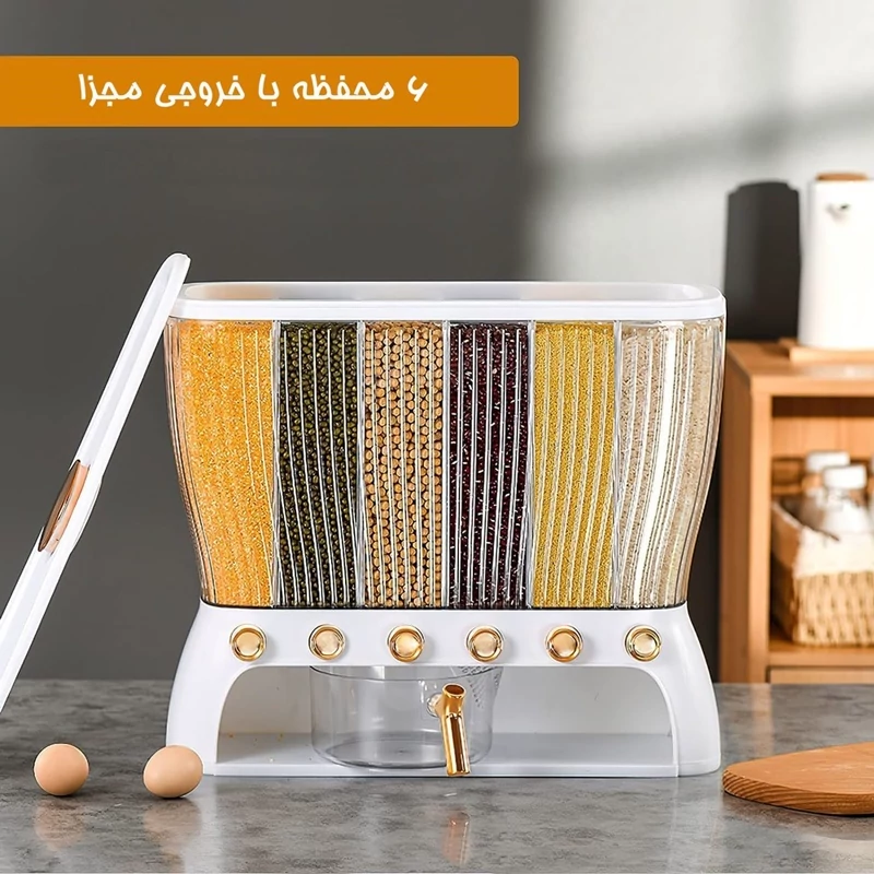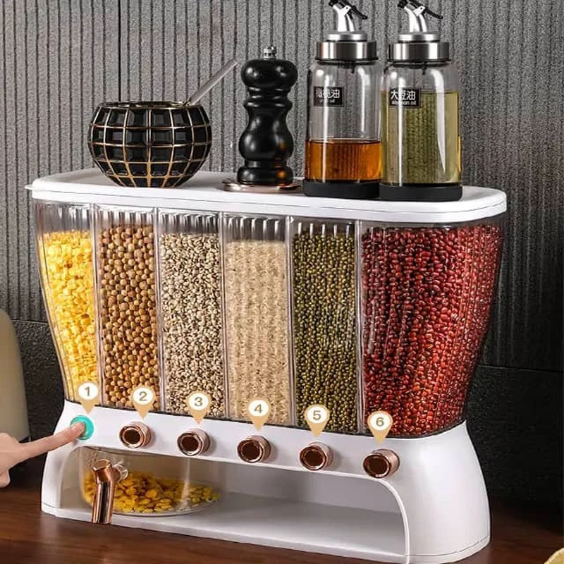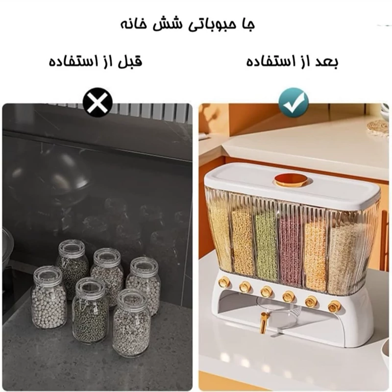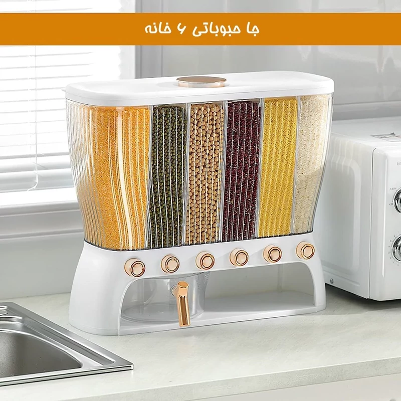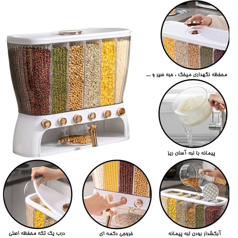 محصولی جدید با طراحی ظاهری زیبا و چشم نواز که در ابتدای کار نمی توان تاثیر آن بر جلوه گری فضای آشپزخانه را نادیده گرفت . این کالا تولید شده از جنس پلاستیک فشرده مقاوم است که استحکام قابل قبولی را نیز برای کالا فراهم آورده . محفظه اصلی به صورت شفاف طراحی شده که علاوه بر افزایش میزان زیبایی محصول ، امکان مشاهده نوع و میزان محتویات داخل جا حبوباتی را برای کاربر از بیرون فراهم آورده ، بدین ترتیب نیازی به باز کردن درب محفظه برای اطلاع از مقدار و محتویات داخل وجود ندارد . محفظه اصلی توسط دیواره های عمودی به شش قسمت مجزا با خروجی اختصاصی تقسیم شده اند ، بدین ترتیب می توانید همزمان و به صورت یکجا ، 6 مدل حبوبات مختلف را درون محفظه ها به صورت تفکیک شده قرار دهید ، بنابراین فضای کمتری اشغال شده و دسترسی ساده تری را به این مواد غذایی خواهید داشت . خروجی محفظه ها در قسمت زیرین هر کدام به صورت تفکیک شده قرار گرفته که با استفاده از نازل دکمه ای شکل ، می توان آن را باز و بسته نمود ، بنابراین به مقدار نیاز می توانید از آن برداشت کنید . به همراه کالا یک پیمانه شفاف و زیبا نیز وجود دارد که دارای لبه خروجی آسان ریز آبکشدار می باشد ، پس می توانید حبوبات خود را داخل همان پیمانه شستشو و آبکشی کنید بدون اینکه نیازی به ظرف مجزای دیگری داشته باشید . دسترسی آسان ، اشغال فضای کمتر به همراه قابلیت استفاده بر روی میز آشپزخانه و کابینت و در نهایت محیا شدن امکان دسترسی ساده تر و سریع تر ، از جمله ویژگی های بارز ظرف حبوبات دکمه ای است .