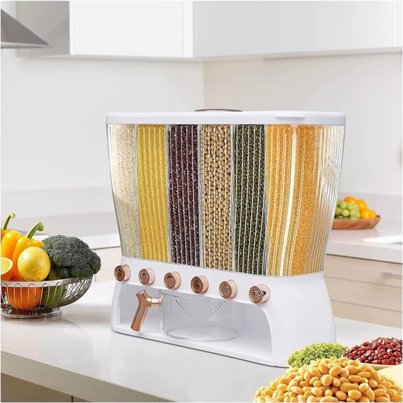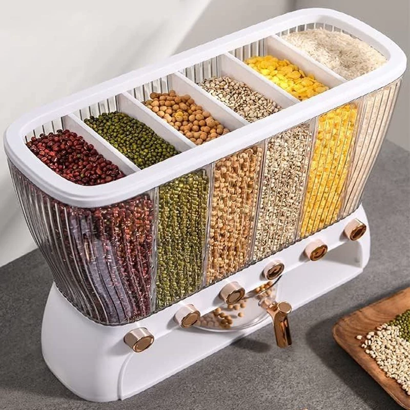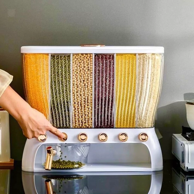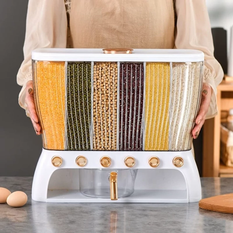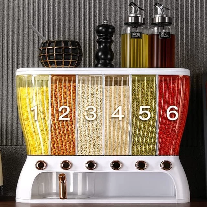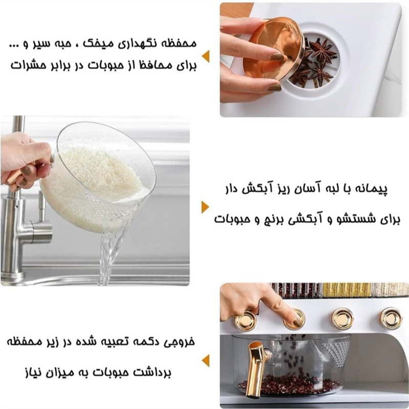 محصولی جدید با طراحی ظاهری زیبا و چشم نواز که در ابتدای کار نمی توان تاثیر آن بر جلوه گری فضای آشپزخانه را نادیده گرفت . این کالا تولید شده از جنس پلاستیک فشرده مقاوم است که استحکام قابل قبولی را نیز برای کالا فراهم آورده . محفظه اصلی به صورت شفاف طراحی شده که علاوه بر افزایش میزان زیبایی محصول ، امکان مشاهده نوع و میزان محتویات داخل جا حبوباتی را برای کاربر از بیرون فراهم آورده ، بدین ترتیب نیازی به باز کردن درب محفظه برای اطلاع از مقدار و محتویات داخل وجود ندارد . محفظه اصلی توسط دیواره های عمودی به شش قسمت مجزا با خروجی اختصاصی تقسیم شده اند ، بدین ترتیب می توانید همزمان و به صورت یکجا ، 6 مدل حبوبات مختلف را درون محفظه ها به صورت تفکیک شده قرار دهید ، بنابراین فضای کمتری اشغال شده و دسترسی ساده تری را به این مواد غذایی خواهید داشت . خروجی محفظه ها در قسمت زیرین هر کدام به صورت تفکیک شده قرار گرفته که با استفاده از نازل دکمه ای شکل ، می توان آن را باز و بسته نمود ، بنابراین به مقدار نیاز می توانید از آن برداشت کنید . به همراه کالا یک پیمانه شفاف و زیبا نیز وجود دارد که دارای لبه خروجی آسان ریز آبکشدار می باشد ، پس می توانید حبوبات خود را داخل همان پیمانه شستشو و آبکشی کنید بدون اینکه نیازی به ظرف مجزای دیگری داشته باشید . دسترسی آسان ، اشغال فضای کمتر به همراه قابلیت استفاده بر روی میز آشپزخانه و کابینت و در نهایت محیا شدن امکان دسترسی ساده تر و سریع تر ، از جمله ویژگی های بارز ظرف حبوبات دکمه ای است .