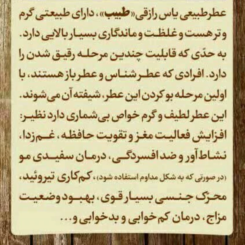 ♦️ عطر طبیعی یاس رازقی برکت، به دلیل طبیعت گرمی که دارد، باب طبع سوداوی مزاجهاست و برای درمان سردردهای سوداوی و بلغمی و بهبود افسردگی بسیار مناسب است.