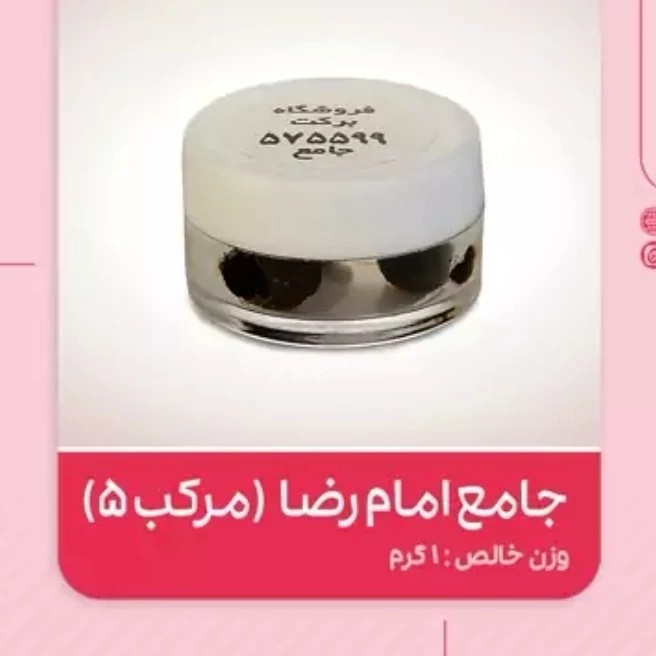 جامع امام رضا (علیهالسلام) (مرکب 5) معروفترین و پر کاربردترین د ا ر و در طباسلامی میباشد که از وجود مقدس امام هشتم «علیهالسلام» به ما رسیده که موارد درمانی زیادی دارد و وجود جامع امام رضا (علیهالسلام) (مرکب 5) در هر خانه لازم و کار گشاست.
