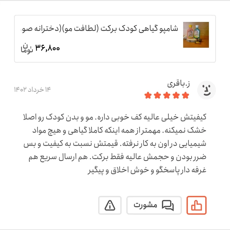👈 برکت با کمک تولیدکنندگان خود برآن شد تا با تحقیق و پژوهش بسیار شامپویی عرضه کند که مناسب پوست و موی کودک دلبند شما باشد و چشم و پوست او کمتر، در حد صفر، دچار حساسیت و سوزش پوستی شود.