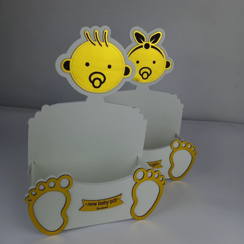 باکس گل شبیه سازی شده نوزاد پسر و دختر ، طراحی زیبا با تلفیق رنگ سفید و طلایی